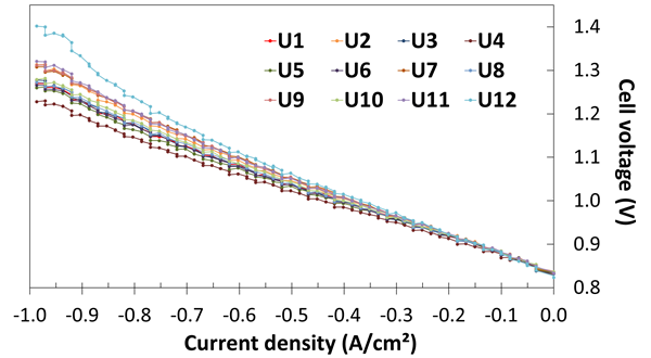 Figure 2 : Courbes de polarisation des cellules CELCER-Gen1 de surface active 200 cm² chacune, mesurées à 800 °C, permettant de valider le jalon de performances de la première phase du projet.