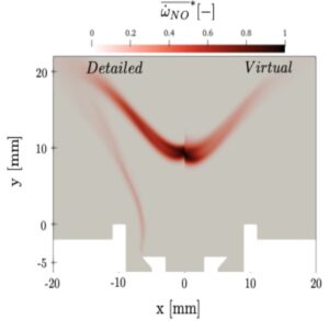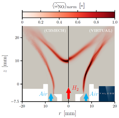Nous avons développé un formalisme de chimie virtuelle permettant de reproduire les propriétés principales de la flamme avec un temps de calcul réduit d’un facteur 40 dans le cas de la combustion de H2 Ce formalisme a été validé sur des configurations expérimentales de plus en plus complexes. Les calculs sont réalisés au moyen du code de calcul YALES2. Une comparaison du champ de taux de production de NO, calculé avec une chimie détaillée et virtuelle, dans une flamme turbulente d’Hydrogène est présentée sur la figure 1