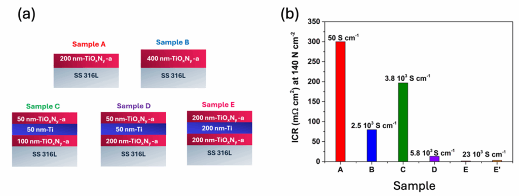 Figure (a) Représentation schématique d’une BPP en SS 316L recouverte de couches protectrices élaborées par pulvérisation magnétron (PVD). (b) Mesure de l’ICR pour différentes multicouches avec les conductivités électriques associées